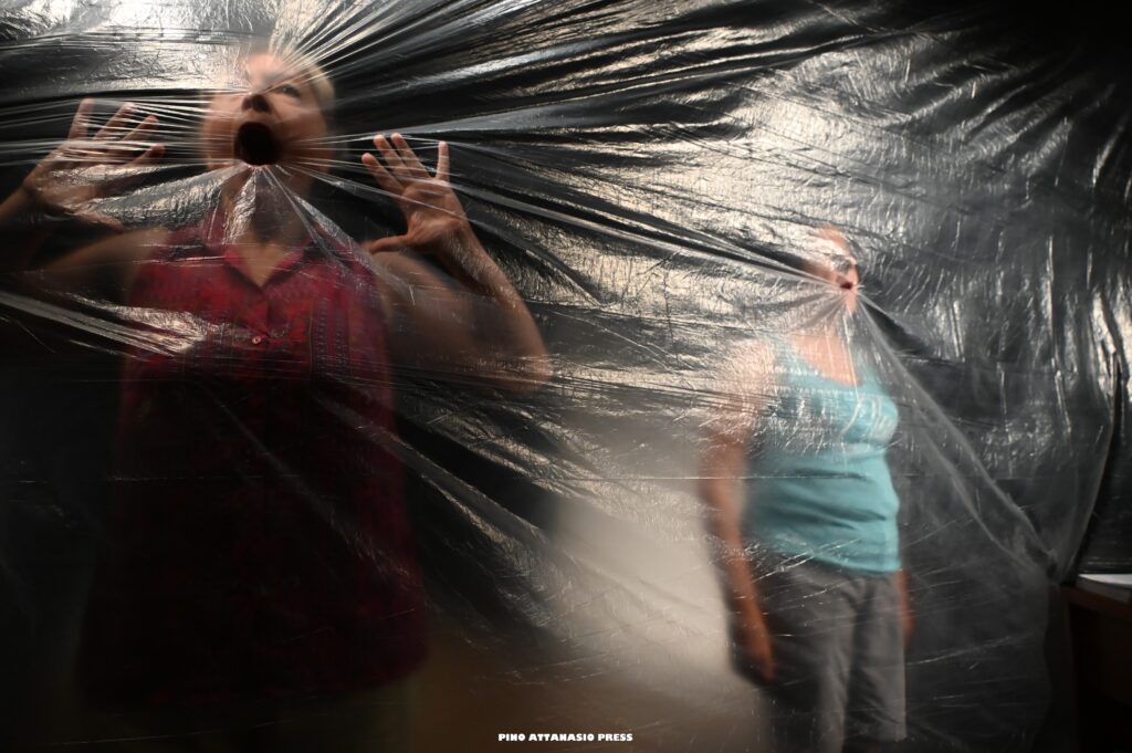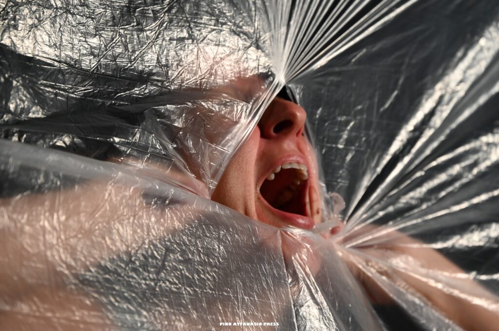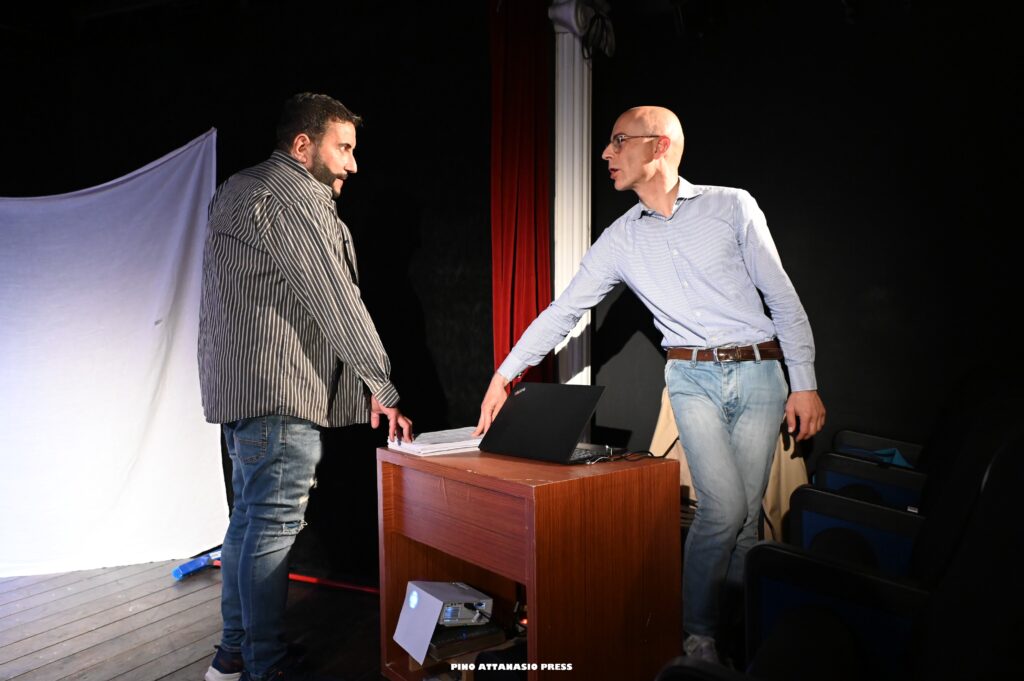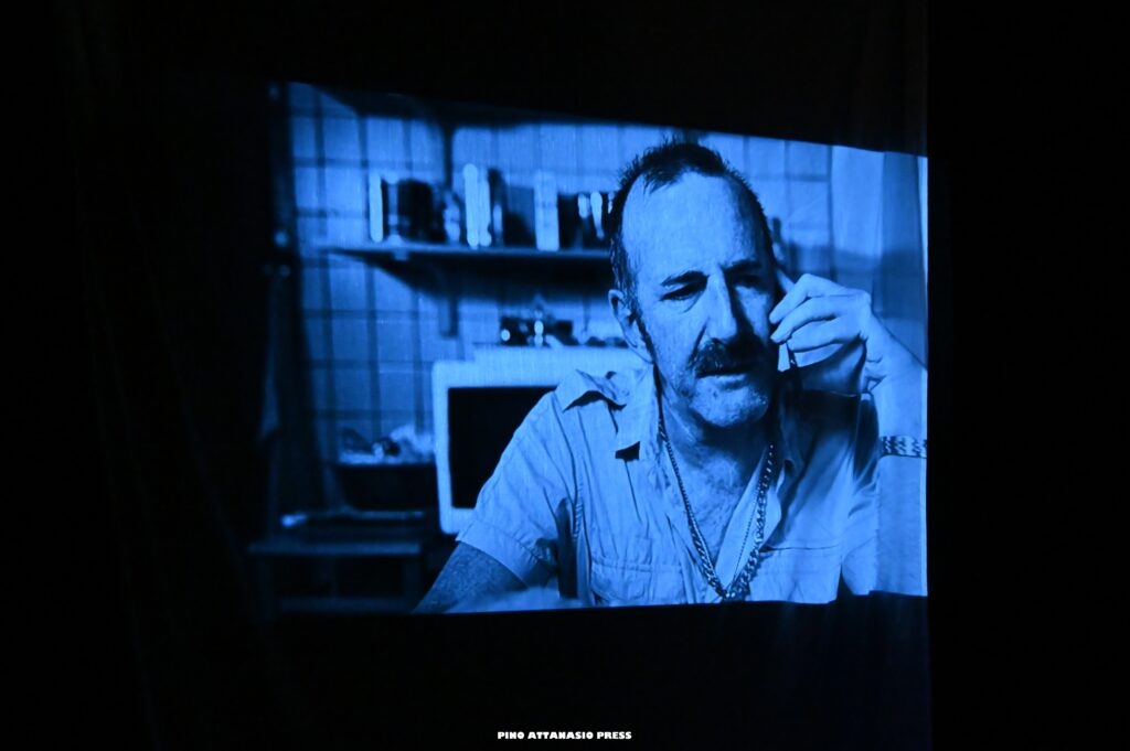 Il mondo violento che le opprime, un mondo maschilista e senza cuore, è racchiuso in brevi video in bianco e nero che narrano le vicende più crude a cui le lavoratrici sono sottoposte ad opera di caporali senza scrupoli. I video non sono altro che la verbalizzazione delle intercettazioni ascoltate dal dipendente del tribunale che, in un angolo del palco, seduto alla sua postazione, incarna il disgusto, la rabbia, l’incredulità di chi scopre quanto disumane possano essere le persone.