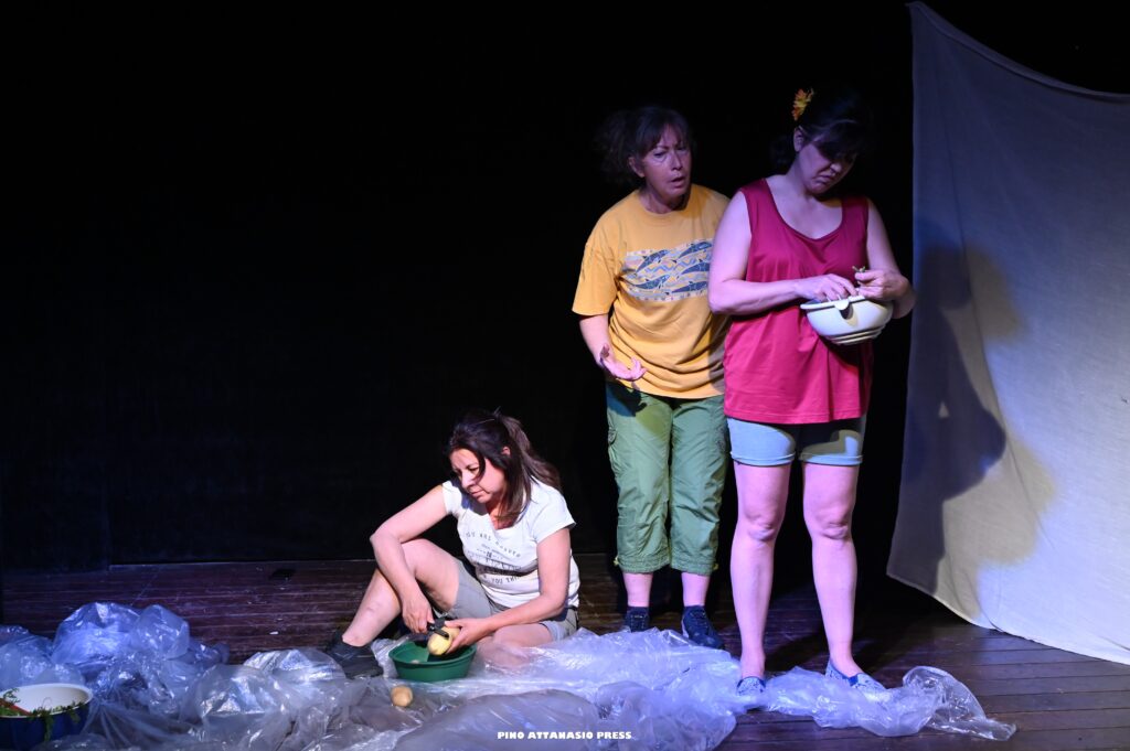Il testo di Valentina Fantasia è scritto con un escamotage che alterna due piani temporali e due situazioni. Da una parte ci sono le tre lavoratrici rimaste che, dopo il lavoro, si ritrovano nella misera casetta che condividono forzatamente. Discutono della loro condizione di schiavitù, litigano, sperano di poter avere almeno una tomba su cui piangere la loro amica, condividono sogni e timori. Dall’altra c’è un impiegato del Tribunale che trascrive le intercettazioni dei caporali, ascolta frasi agghiaccianti tra uomini senza coscienza che parlano dei braccianti come di animali e che pensano solo alla raccolta delle verdure, al profitto, al lavoro.