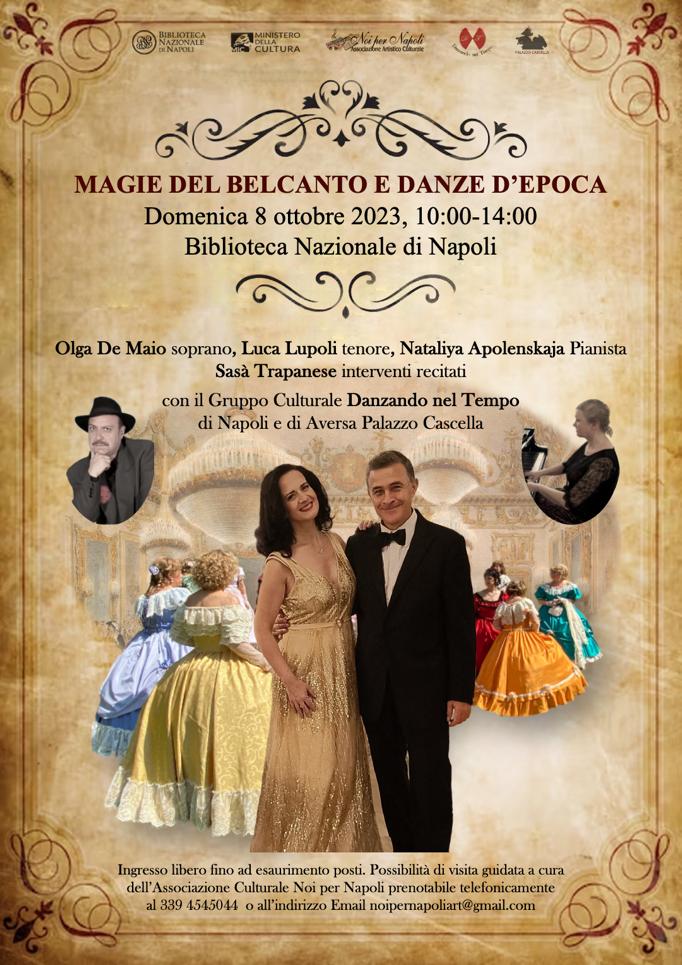 Dopo la visita guidata alla mostra allestita nelle sale della Lucchesi Palli, il soprano Olga De Maio ed il tenore Luca Lupoli , in concerto accompagnati al pianoforte da Nataliya Apolenskaja, faranno rivivere la magia delle più note arie del repertorio di carusiano , interventi recitati dell’attore Sasà Trapanese., con le danze d’ epoca a cura del Gruppo Culturale Danzando nel Tempo