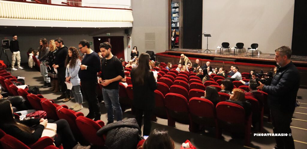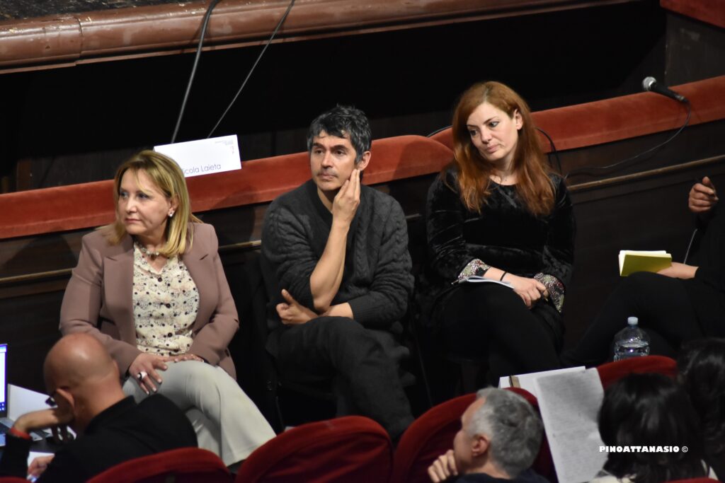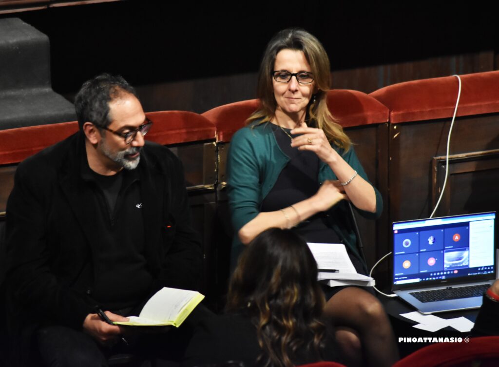 A dare i saluti istituzionali: Enricomaria Corbi – Direttore del Dipartimento di Scienze formative psicologiche e della comunicazione Unisob; Mimmo Basso – Direttore operativo del Teatro di Napoli – Teatro Nazionale; Armida Filippelli – Assessore regionale alla Formazione professionale della Regione Campania; Ettore Acerra – Direttore generale Ufficio Scolastico Regionale della Campania; Maura Striano – Assessore all’Istruzione del Comune di Napoli; Nadia Baldi – Vice direttrice artistica Campania Teatro Festival e regista.