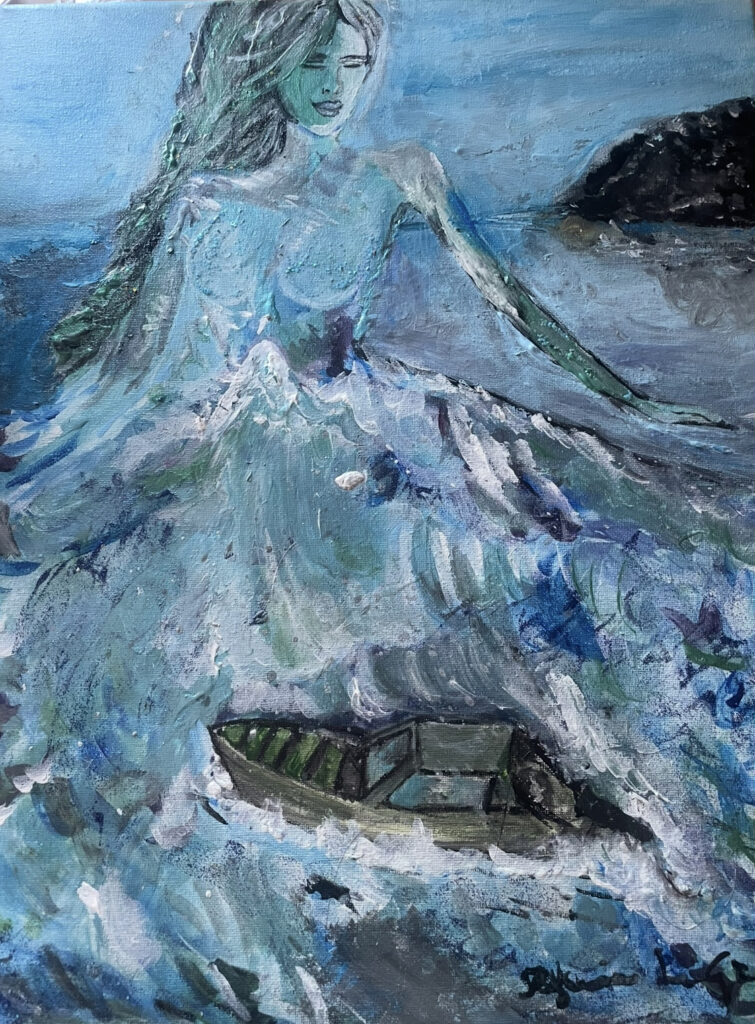 Attraverso figure femminili che emergono dall’acqua come sogni o presagi, la mostra esplora la potenza archetipica del mare e la trasformazione interiore della donna. Le onde non sono solo onde: sono moti dell’anima, emozioni profonde, richiami dell’inconscio.