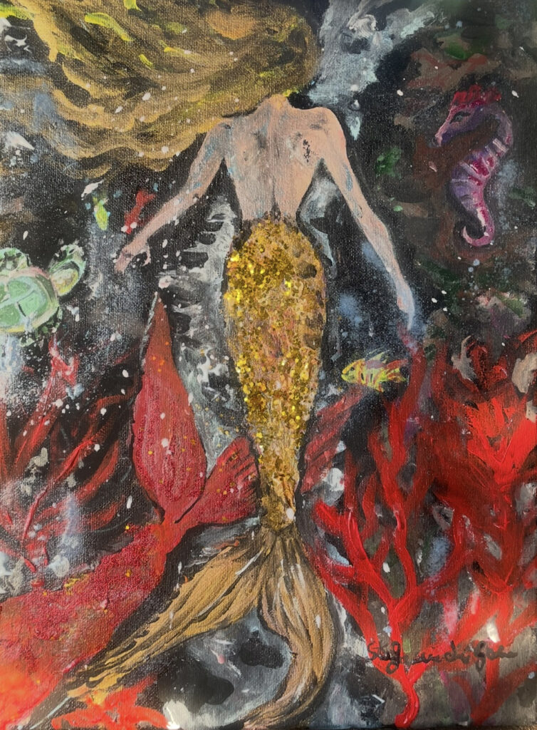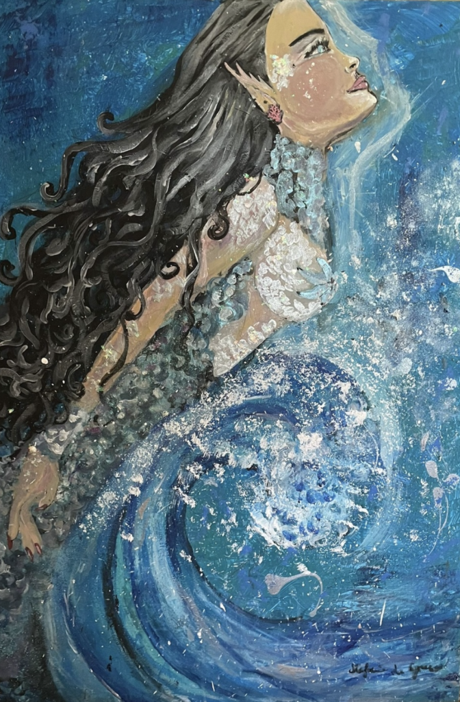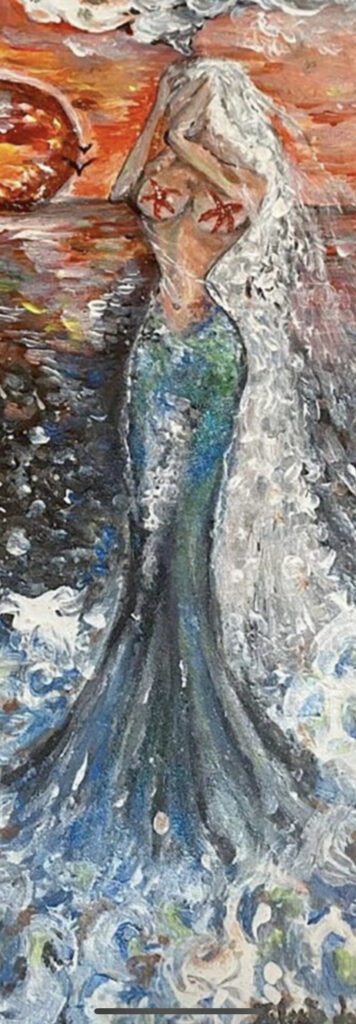 Sirene, dee e tempeste interiori si incontrano in un’esplorazione poetica e sensuale del femminile sacro. L’artista, in parte sirena lei stessa, trasforma il suo corpo in tela viva, rendendo l’opera un rito, un richiamo, un canto antico.