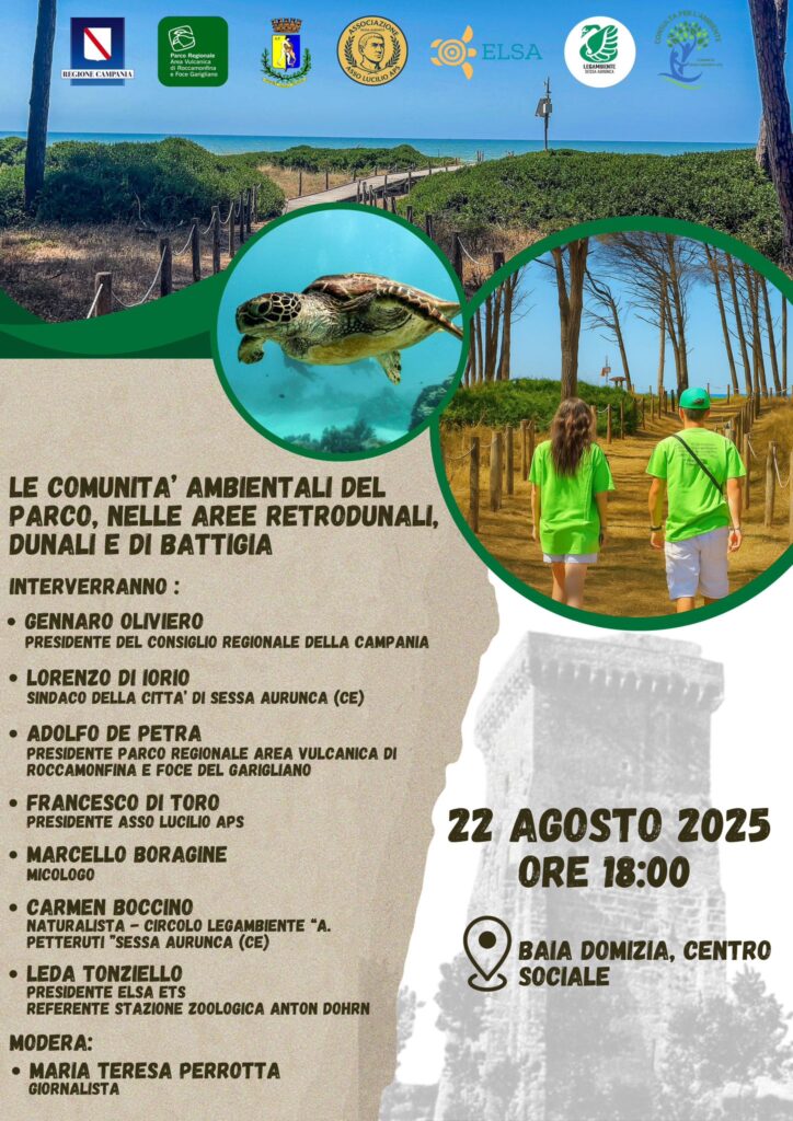 L’evento, promosso dal Parco Regionale e da Asso Lucilio APS e moderato dalla giornalista Maria Teresa Perrotta, si inserisce nel programma dell’Estate 2025 che ha visto l’istituzione di un presidio informativo nella Pineta di Baia Domizia e la terza edizione di Sentieri d’Incanto presso la Torre di Pandolfo Capodiferro.