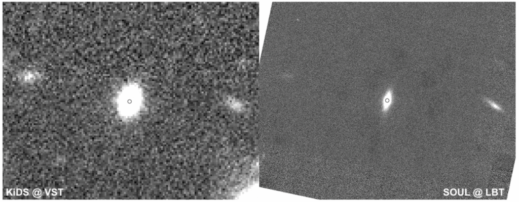 Sulle dimensioni e la struttura della galassia, tuttavia, restavano alcune incertezze. Per confermare la compattezza della galassia, sono state cruciali nuove osservazioni realizzate con il Large Binocular Telescope (LBT), in grado di ottenere immagini molto più nitide grazie al sistema SOUL di ottica adattiva, che compensa in tempo reale gli effetti della turbolenza atmosferica. Le osservazioni della galassia KiDS J0842+0059 raccolte con LBT hanno un grado di dettaglio dieci volte superiore rispetto ai dati della survey KiDS: sono le immagini più dettagliate di una galassia relic a questa distanza e consentono di studiarne forma e dimensioni come mai prima d’ora.