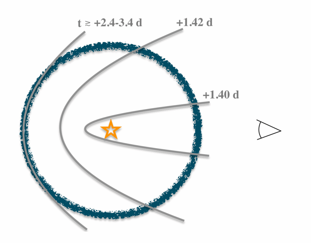 Figura 1: diagramma schematico, non in scala, del sito dell’esplosione di SN 2024bch. La supernova è indicata dalla stella al centro, mentre il materiale circumstellare che emette le righe strette è la regione blu più lontana. Le parabole rappresentano la luce emessa dalla supernova a diverse epoche e intercettano il mezzo circumstellare finché non raggiungono l’estremità opposta all’osservatore, circa 2,4 giorni dopo l’esplosione. Questa semplice geometria riesce a spiegare in modo molto efficace l’evoluzione del transiente nell’ipotesi in cui gli ejecta non interagiscono con il mezzo. Crediti: L. Tartaglia et al. / A&A 2025