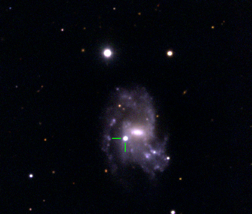 Figura 2: immagine a colori della galassia ospite di SN 2024bch (la supernova è indicata in verde), ottenuta sommando tre immagini in diversi filtri, acquisite con la camera AFOSC del telescopio Copernico, presso la stazione osservativa INAF di Asiago, gestita dall’Osservatorio Astronomico di Padova. Crediti: A. Reguitti / INAF