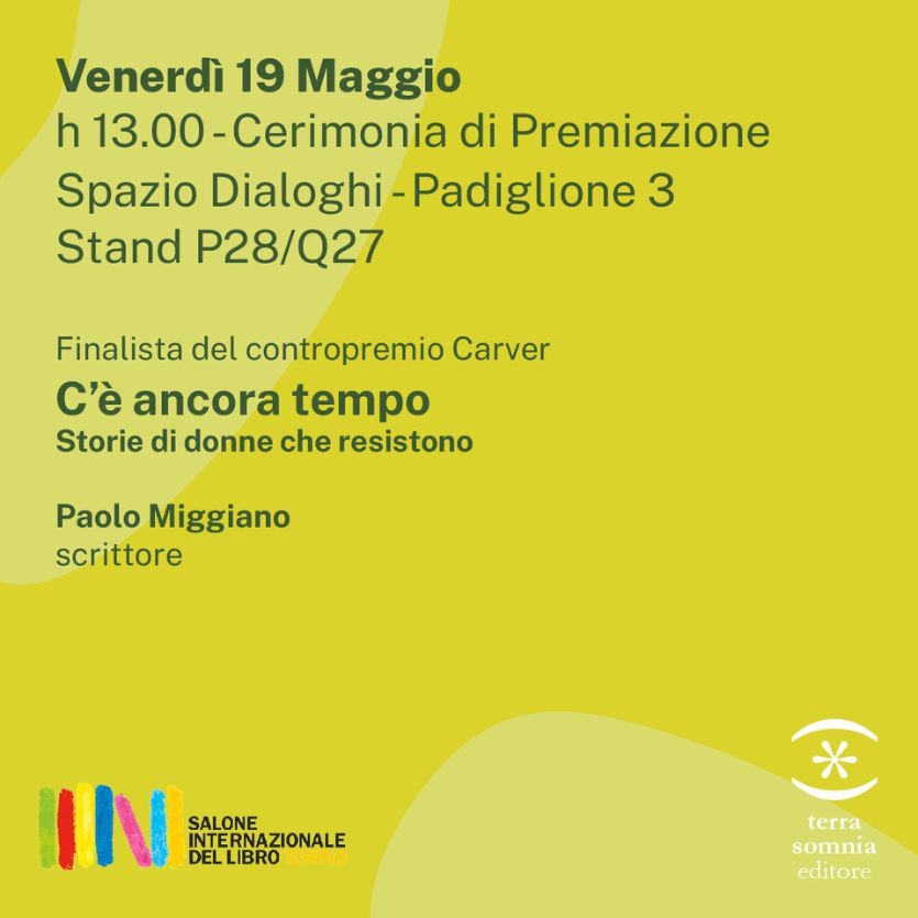 In occasione della più importante chermes internazionale del libro in Italia e in Europa, un autore e socio fondatore di Terra Somnia, lo scrittore di origini Salentine, ma cittadino di Caserta, Paolo Miggiano, sarà protagonista di uno degli eventi più importanti del Salone: Miggiano, infatti, con il suo libro “ C’è ancora tempo – Storie di donne che resistono ” è nella cinquina finalista del Contropremio Carver .