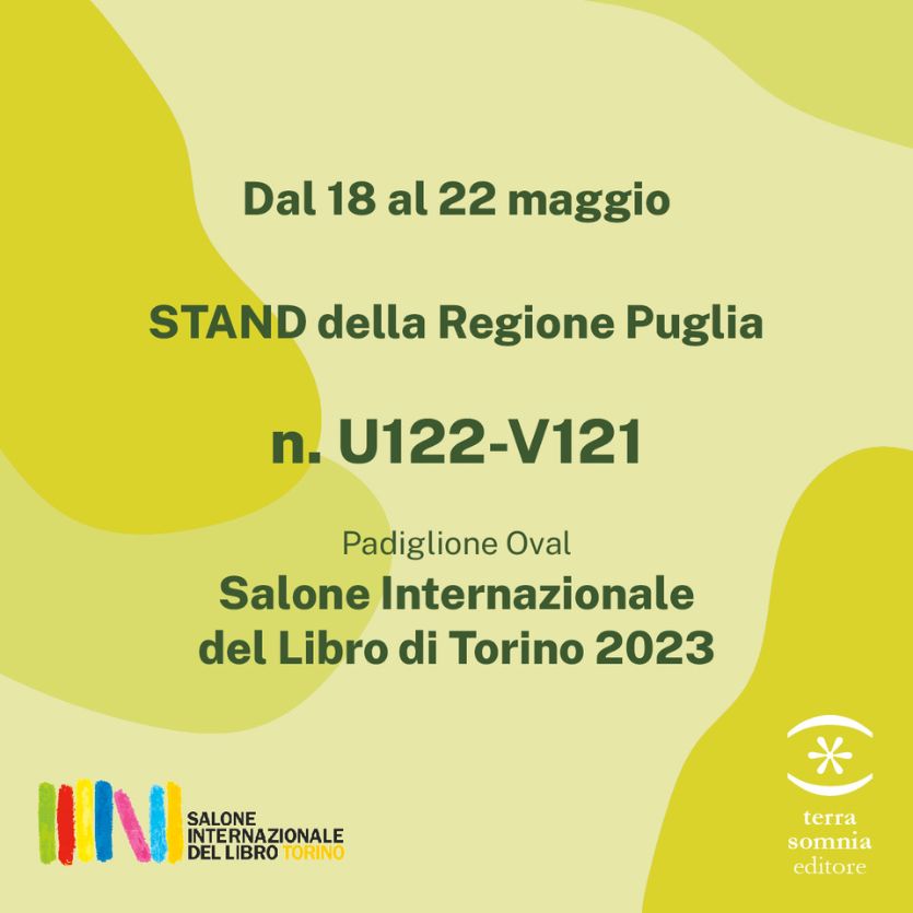 Terra Somnia Editore, la casa editrice del Salento, con il cuore che batte a Caserta e a Napoli, sarà al Salone Internazionale del libro di Torino che si terrà dal 18 al 22 maggio al Lingotto Fiere della Città piemontese. La casa editrice sarà presente, con il proprio catalogo, presso il Padiglione Oval – Stand della Regione Puglia n. U122-V121.
